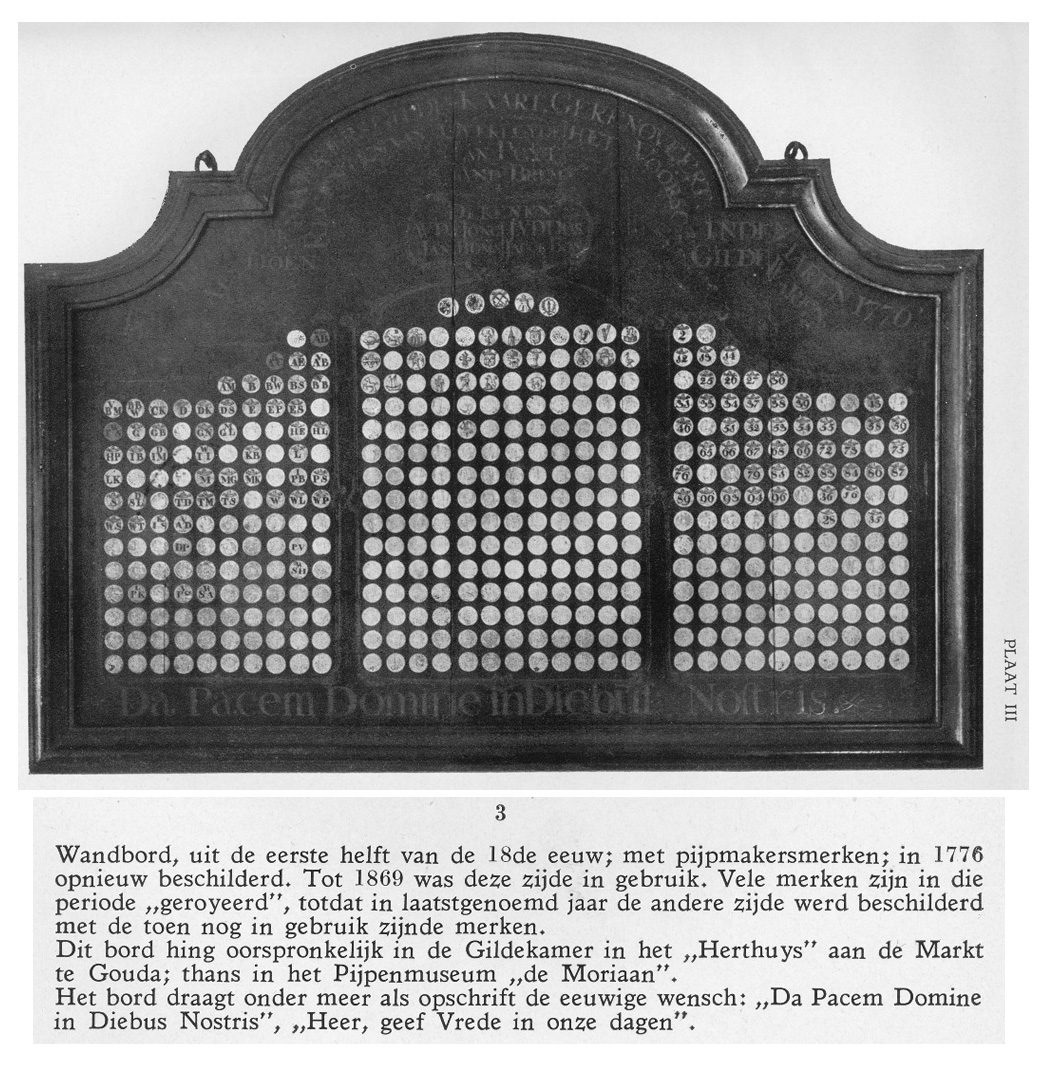 1800年代前半のパイプ職人をマークで表示した掲示板。1776年に新しく描かれて1869年まで使用された。多くのマークがこの時(1776)に削除されて、前記の時(1869)まで板の裏面を使って描き直したものが使われた。当時はまだ職人名の代わりにマークで表す習慣だった。この表示板は最初はハウダ市のHerthuys市場に在った同業組合の小部屋に掛けられていた。現在はMoriaan博物館にある。この板には永遠の願望を表す碑文なども書かれている<最下段のラテン語文のこと>;